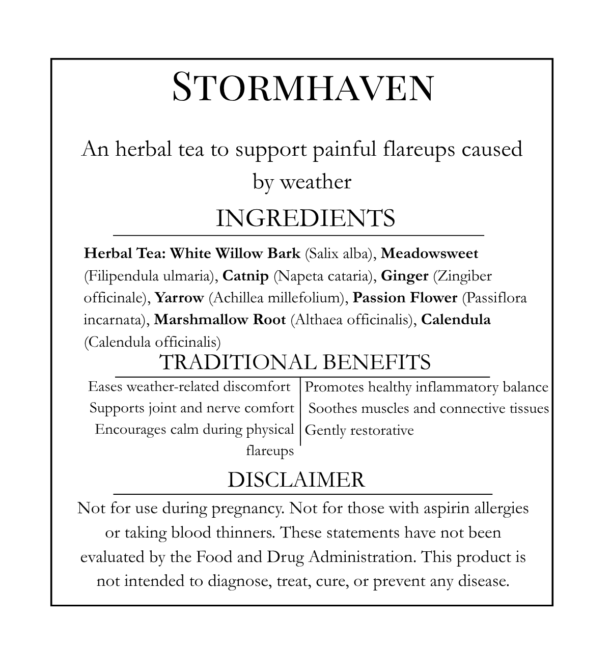 An herbal tea crafted to support comfort during weather-related flare-ups. Traditionally used to ease joint and nerve discomfort, promote healthy inflammatory balance, and soothe muscles and connective tissues, this restorative blend encourages calm and gentle relief when the body feels sensitive to changing conditions.